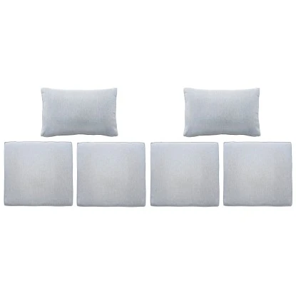 Mit der 6-teiligen Kissenbezugs-Garnitur in Hellgrau lassen sich die Auflagen des Balkonmöbelsets Olea neu gestalten. Sie dienen als Ersatz für verschlissene Bezüge oder schaffen eine neue Optik. Das Set besteht aus zwei Bezügen für die Rückenkissen in der Größe 35 cm x 55 cm x 22 cm sowie vier Sitzkissenbezüge mit den Maßen 9 cm x 55 cm x 55 cm (jeweils H x B x T). Gefertigt sind die Überzüge aus 100 % Polyester. Das Material erweist sich als ebenso unempfindlich wie strapazierfähig. Verschmutzungen können von Hand entfernt werden.
