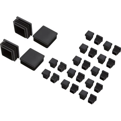 Das 28-teilige Fußkappen-Set in der Farbe Schwarz ersetzt die ursprünglichen Füße des Eck-Diningsets Vermont. Es kommt zum Einsatz, wenn die originalen Endstücke abgenutzt sind oder verloren wurden. Das Set besteht aus vier Kappen für den Tisch in der Größe 2,2 cm x 4 cm x 4 cm und 24 Kappen für die Sitzmöbel mit den Maßen 2,3 cm x 1,8 cm x 1,8 cm (jeweils H x B x T). Sie sind aus robustem Kunststoff gefertigt und können ohne Werkzeug aufgesteckt werden. Der Satz ist ausreichend für die gesamte Essgruppe.
