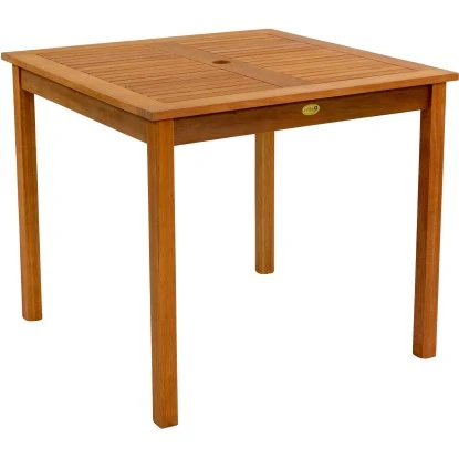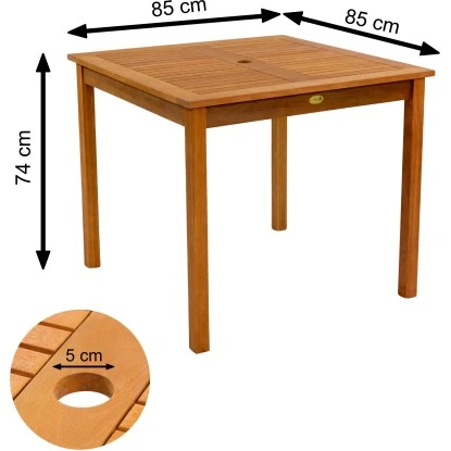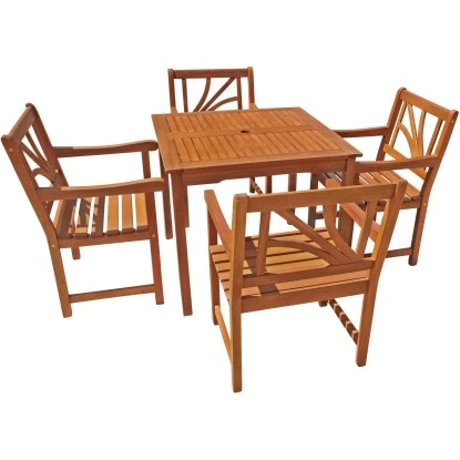 Das Set besteht aus vier Stühlen mit Armlehne und einem Quadratischen Tisch. Eine Öffnung für den Sonnenschirm befindet sich in der Mitte der Tischplatte.