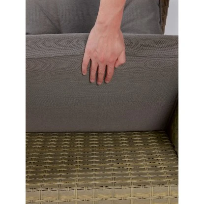 Dank des leichten, aber sehr stabilen Aluminiumgestells können Sie den Sessel ohne viel Mühe an den von Ihnen gewünschten Ort bewegen. Sein handgeflochtenes Polyrattan-Geflecht in der Farbe Forest ist wetterfest und pflegeleicht. Für einen hohen Sitzkomfort sorgen die bequeme Auflage und ein Kissen. Die Bezüge bestehen aus 100 % Polyester in der Farbe Jungle. Das Sitzkissen aus Schaumstoff hat eine Stärke von 10 cm, während das Rückenkissen über eine Füllung aus 6 cm starkem, gesponnenem Polyester verfügt. Der Sessel hat die Maße 88 cm x 77 cm x 71,5 cm (H x B x T) und lässt sich ideal mit anderen Möbelstücken aus der Serie Vermont kombinieren.