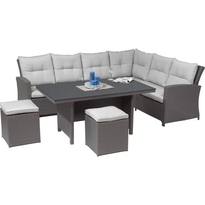 Das 5-teilige Lounge-Set mit Esstisch der Serie Vermont mit einer Eckbank rechts lädt zum Relaxen und gemütlichen Beisammensitzen ein. Die Gartenmöbelgruppe besticht durch ihr hochwertiges Material, ihren extra Komfort und ihr stilvolles Design. Dank der cleveren Kombination aus Lounge- und Esstisch-Gruppe eignet sie sich sowohl zum entspannten Verweilen in Ihrem Garten als auch für einen gemeinsamen Grillabend in größerer Runde. Denn Sitzbänke besitzen die praktische Eigenschaft, viel Sitzfläche mit wenig Möbeln zu bieten. Die beiden handlichen Hocker sind flexibel arrangierbar. An dieser Rattangarnitur können bis zu sieben Personen Platz finden. Auch können Sie einen weiteren Gartensessel der Serie Vermont ergänzen (nicht im Lieferumfang enthalten). Zudem verfügt der Tisch über eine angenehme Höhe und ist mit einer pflegeleichten Glasplatte in Grau ausgestattet.