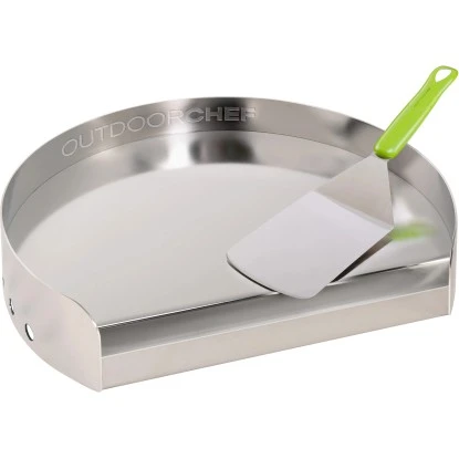 Robuste Plancha aus Edelstahl mit großzügiger Fettwanne und integriertem Lüftungssystem. Die X-Verstrebung am Boden verhindert ein Verziehen des Stahls. Diese Platte eignet sich perfekt für Outdoorchef Gas-Kugelgrills. Dabei wird auf den Grillrost verzic